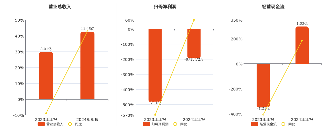 公司营业总收入为11.45亿元。归母净利润为-8713.72万元,在已披露的同业公司中排名第44。经营活动现金净流入为1.03亿元。
