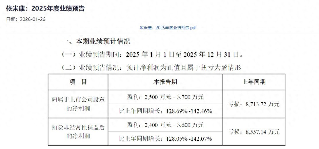 1月26日晚间,依米康发布2025年业绩预告,公司预计全年归属于上市公司股东的净利润为盈利2500万元至3700万元,同比增幅达到128.69%至142.46%。