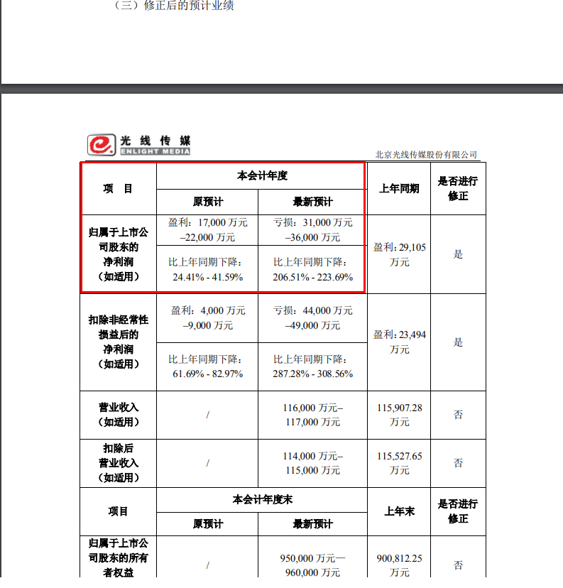 光线传媒表示,本次业绩预告修正系2021年非上市企业全面执行新准则后,公司投资的两家合伙企业调整对其投资项目的核算方法从而导致的对公司业绩的不利影响,前次业绩预告产生较大波动并非公司的主观故意。