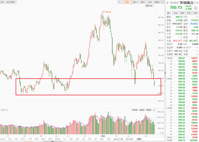 根据东方财富,“影视概念”板块指数在今年年初上冲900点受阻之后,目前已经回落至700点附近,大约和2021年8-10月的指数水平相当。