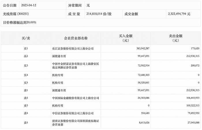 4月12日,光线传媒今日20cm涨停,成交额23.22亿元,换手率7.71%,盘后龙虎榜数据显示,深股通专用席位买入9944.71万元并卖出2.13亿元,二机构净买入1.31亿元,一机构净卖出1.01亿元,小鳄鱼席位净买入3.84亿元。