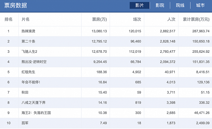 票房前4名影片分别为《热辣滚烫》、《飞驰人生2》、《熊出没·逆转时空》、《第二十条》,国家电影专资办数据显示,截至2月19日下午14时30分,四部电影累计票房分别为28.8亿元、25.56亿元、15.18亿元、15.07亿元。