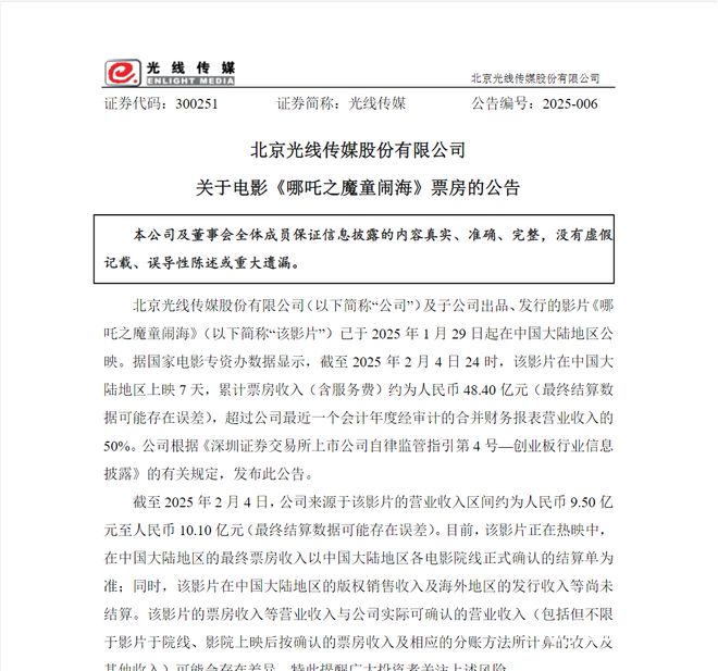 除关于股票异常波动的提醒外,光线传媒也发布了一则《关于电影票房的公告》,其中披露了该公司通过《哪吒2》营收的相关情况。