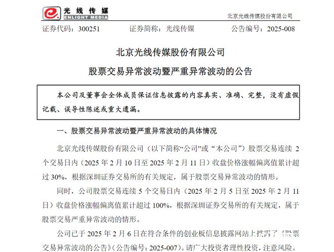 对于股价的“大起大落”,光线传媒近日曾多次发布提醒。南都·湾财社记者注意到,光线传媒分别于2月6日、11日和13日发布《股票交易异常波动的公告》或《股票交易异常波动暨严重异常波动的公告》,提醒广大投资者理性投资,注意风险。