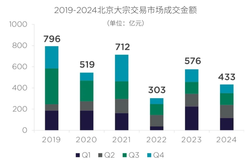 在翰同资本收购家和超市之时,北京大宗物业流动性还是比较强的。根据戴德梁行发布的数据,2021年,北京大宗资产交易成交金额高达712亿元,出现阶段性新高。但是此后市场开始调整,2022年是303亿元,尽管2023年回升至576亿元,2024年433亿元,但都明显低于2021年。