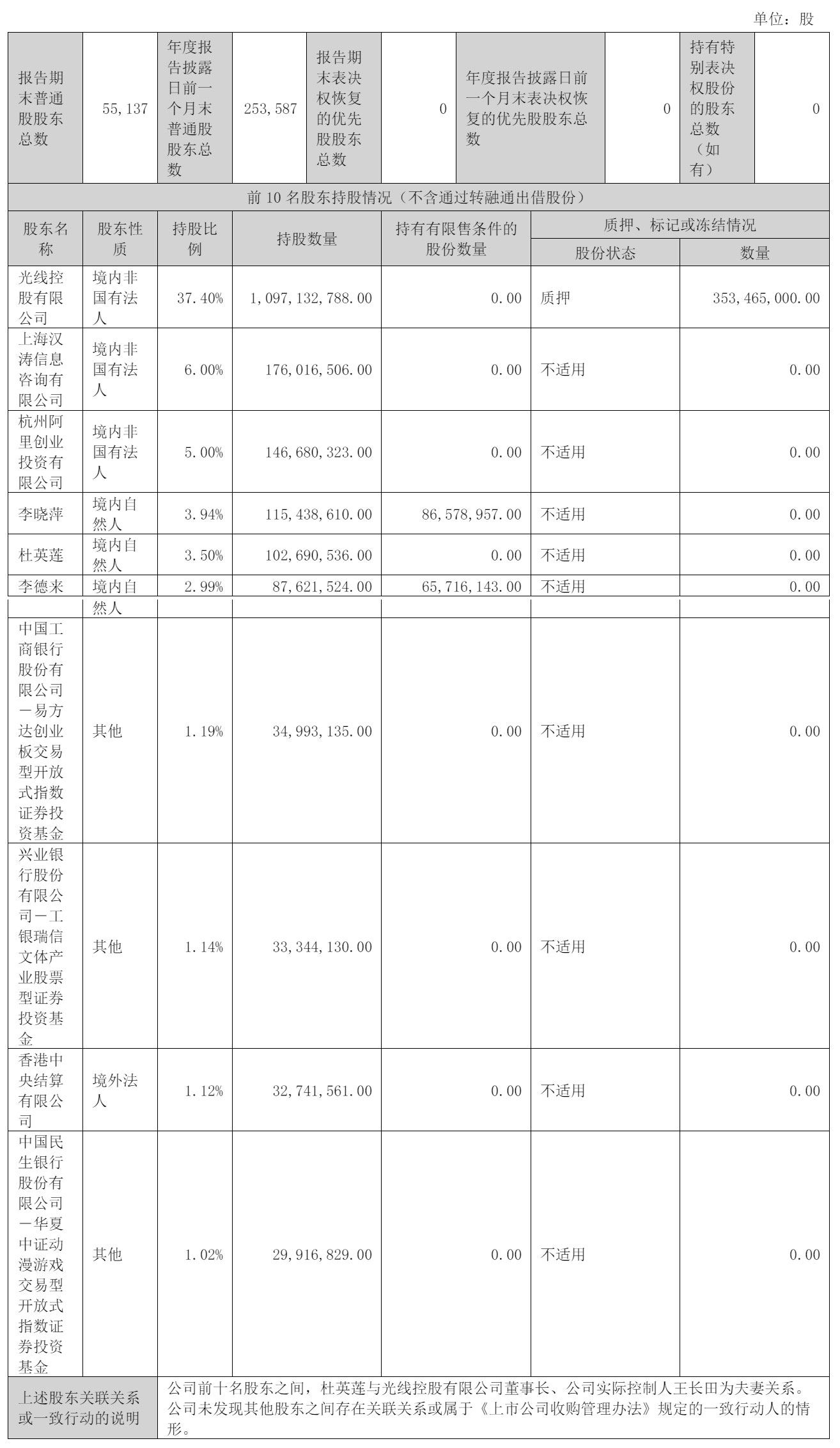 截至2025年3月31日,光线控股有限公司持股37.4%,上海汉涛信息咨询有限公司持股6%,李晓萍持股3.94%,杜英莲持股3.5%,李德来持股2.99%,中国工商银行股份有限公司-易方达创业板交易型开放式指数证券投资基金持股为1.11%,香港中央结算有限公司持股为1.1%;