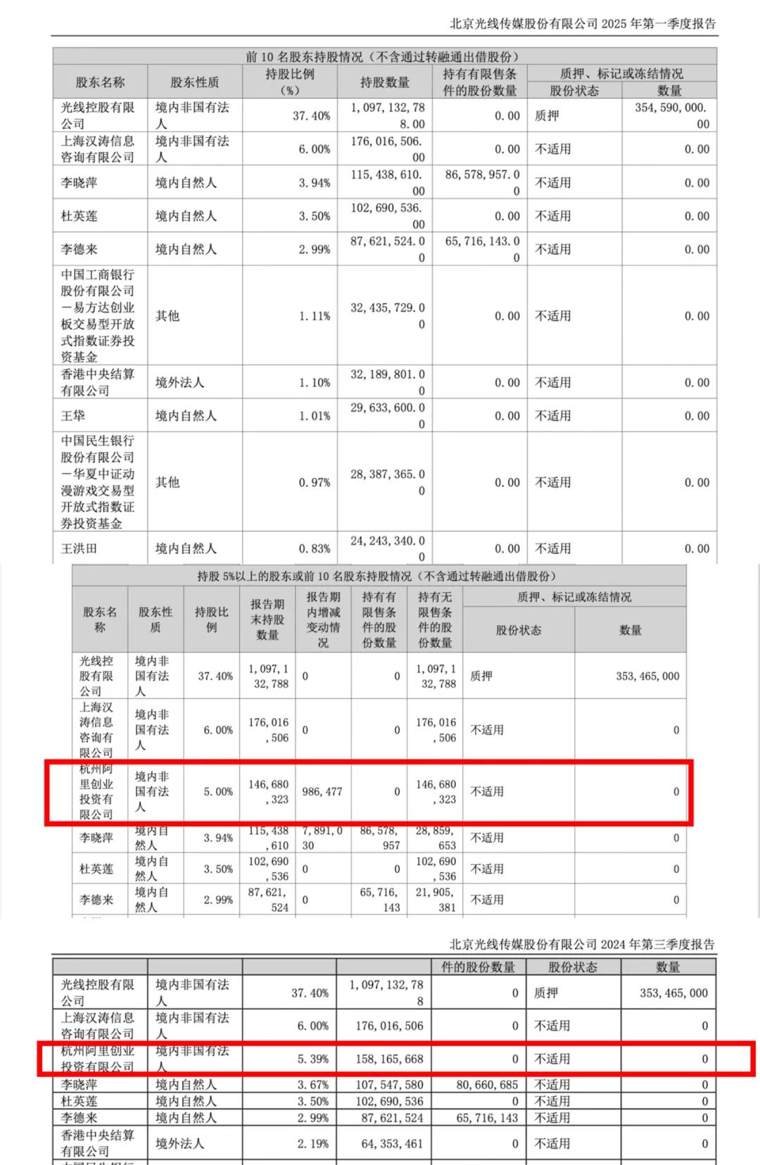 此外,据媒体报道,光线传媒证券部相关工作人员表示,2024年年报披露时,阿里创投持股比例无限接近于5%,却未到5%。因数据只保留到小数点后两位,四舍五入到了5%。因此,阿里创投的减持并未公开披露,目前其是清仓还是剩少许持股,不得而知。