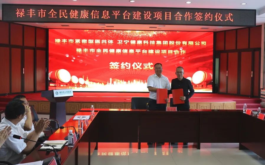 签约仪式上,禄丰市人民医院院长、医共体总院院长刘汝艳和卫宁健康总裁王涛共同携手签署了合作协议。