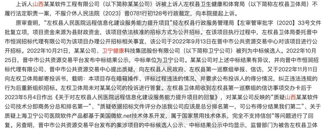 山雨欲来风满楼,公司的过往也被揭开。中国裁判文书网披露,山西某软件公司曾起诉左权县卫生健康和体育局,起因是2022年其与卫宁健康在投标医院远程信息化项目中落选,但对结果存有异议,并发起举报、诉讼。