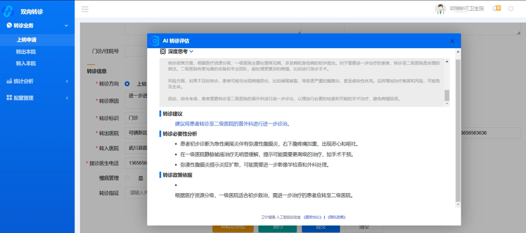 卫宁健康以“DeepSeek+WiNEX Copilot”模式赋能呼和浩特市统建医共体信息化建设,成功落地多项AI服务。其中,“AI转诊评估”服务通过智能匹配牵头医院与基层医疗机构资源,优化转诊流程,显著缩短决策时间,提升全市医疗资源利用效率。