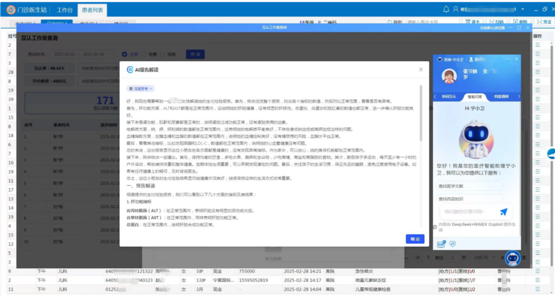 卫宁健康与自治区卫健委协作,采用“DeepSeek+WiNEX Copilot”部署模式,为全区医疗机构和管理者提供智能问答助手“医助-宁小卫”、“检查检验报告AI解读”和“检查检验互认驾驶舱智能分析”服务。