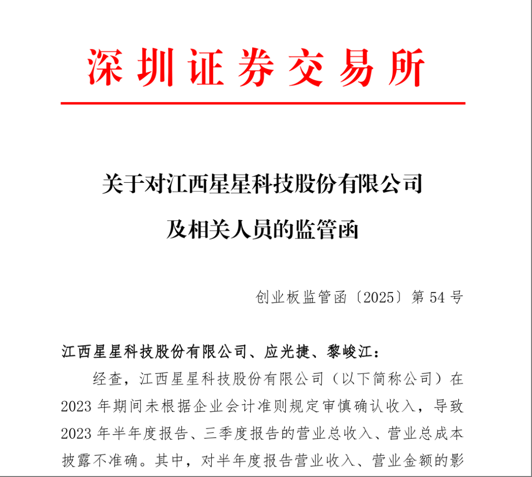因未按规定审慎确认收入导致多期财报披露不准确,5月20日,星星科技(300256)及其相关责任人接连收到江西证监局警示函和深交所创业板公司管理部下发的监管函。