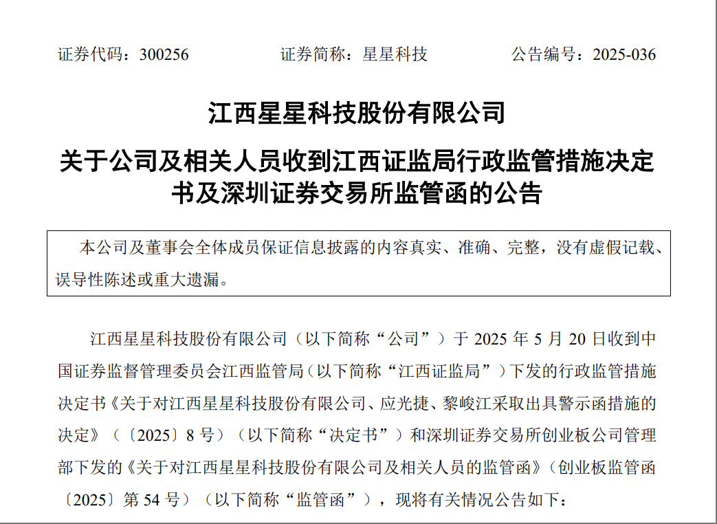 公告显示,星星科技于5月20日收到江西证监局下发的行政监管措施决定书《关于对江西星星科技股份有限公司、应光捷、黎峻江采取出具警示函措施的决定》和深圳证券交易所创业板公司管理部下发的《关于对江西星星科技股份有限公司及相关人员的监管函》。