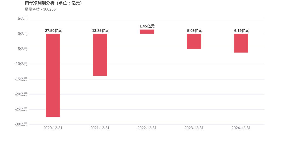 利润角度分析,2020年星星科技实现归母净利润-27.50亿元,2024年-6.19亿元。亏损幅度有所收窄,但仍处于亏损状态。