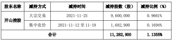 开山股份公告显示,自前次披露《权益变动报告书》后,截止本次(2021年11月12日-11月25日)减持后,开山控股及其一致行动人累计减持比例为4.61%。