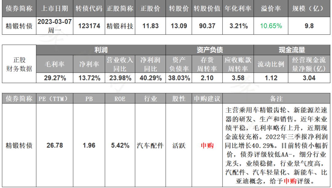 正股主营乘用车精锻齿轮、新能源差速器的研发、生产和销售。近年来业绩平稳,毛利率略有上升,近期现金流较充裕。2022年三季报净利润同比增长40.29%。