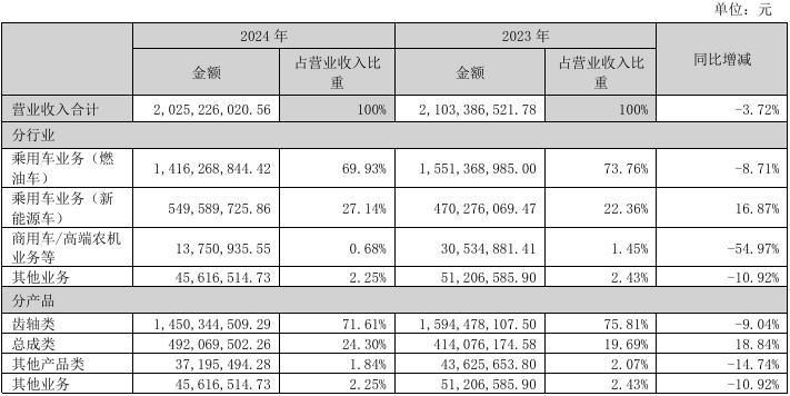 其中,齿轴类产品销售额占营业收入的比例为71.61%;总成类产品销售额占营业收入的比例为24.3%;其他产品销售额占营业收入的比例为1.84%。公司为新能源车配套的产品销售额占产品销售收入的比例为27.14%,同比提升4.78个百分点。