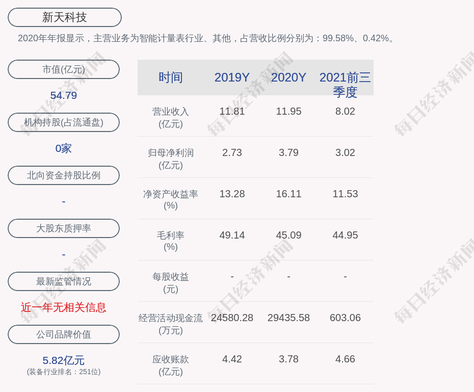 2020年年报显示,新天科技的主营业务为智能计量表行业、其他,占营收比例分别为:99.58%、0.42%。