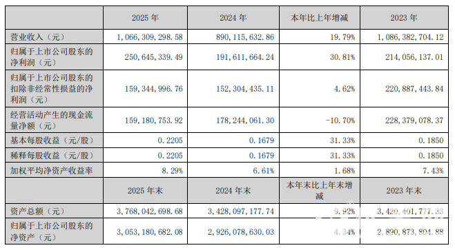 年度报告显示,2025年新天科技整体经营态势稳健向好,核心财务指标均实现同比大幅增长。其中,公司全年实现营业收入10.66亿元,同比增长19.79%,规模扩张态势明显;归属于上市公司股东的净利润达25064.53万元(约2.51亿元),同比增幅达30.81%,盈利增速显著高于营收增速,盈利能力持续增强;基本每股收益0.22元,同比增长31.33%。