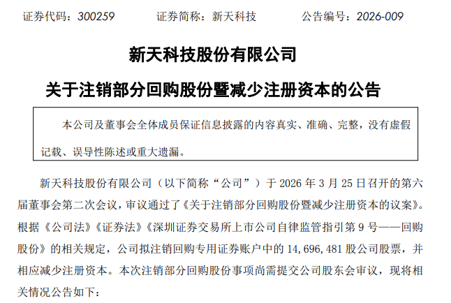3月26日,新天科技(300259)发布公告,宣布拟注销回购专用证券账户中14,696,481股股份并相应减少注册资本,这一举措是公司基于自身发展规划与资本市场规则做出的重要资本运作决策,不仅将优化公司股本结构,更向市场传递出对自身价值的高度认可与未来发展的坚定信心。