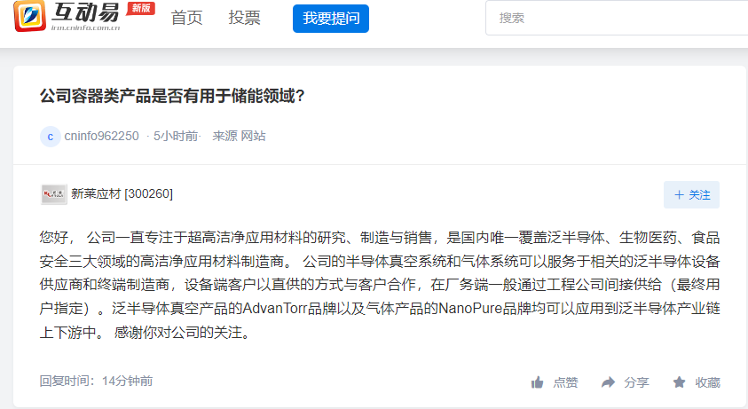 新莱应材21日在互动平台回答投资者提问时介绍,公司的半导体真空系统和气体系统可以服务于相关的泛半导体设备供应商和终端制造商,设备端客户以直供的方式与客户合作,在厂务端一般通过工程公司间接供给(最终用户指定)。泛半导体真空产品的AdvanTorr品牌以及气体产品的NanoPure品牌均可以应用到泛半导体产业链上下游中。