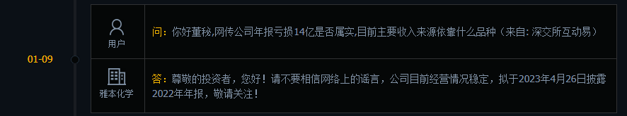 消息面上,有投资者提问“网传公司年报亏损14亿是否属实?”雅本化学1月9日在互动平台表示:请不要相信网络上的谣言,公司目前经营情况稳定,拟于2023年4月26日披露2022年年报。