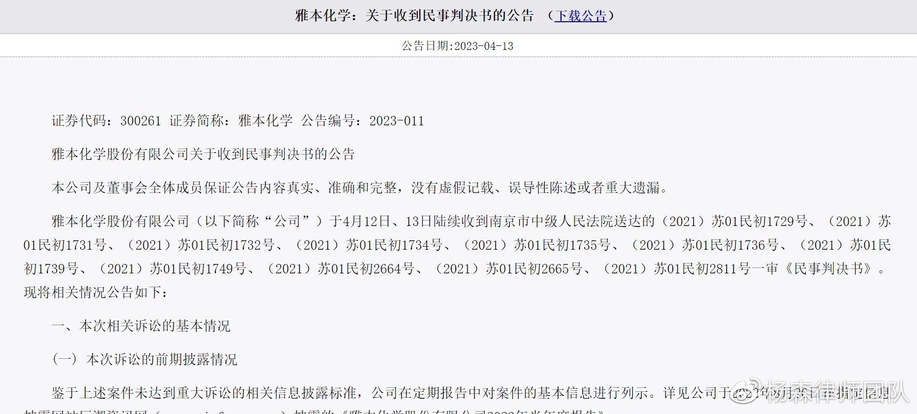 2023年4月13日,雅本化学股份有限公司(简称公司或者雅本化学)13日公告,于4月12日、13日陆续收到南京市中级人民法院送达的一审判决。南京中院判决公司需向11位投资者支付合计194万余元的损失。