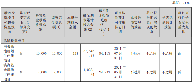 值得一提的是,南通基地新增生产线项目受外部宏观环境以及化工行业监管日益严格的影响、滨海基地新增生产线项目因受全球经济形势的影响以及化工行业监管日益严格的影响,导致项目建设进度放缓,募投项目实施存在滞后情形,无法在预计时间内达到预定可使用状态。公司根据募投项目的实施进度、实际建设情况及市场发展前景,经过谨慎研究论证,决定将滨海基地新增生产线项目延期至2024年5月,决定将南通新增生产线项目延期至2024年7月。