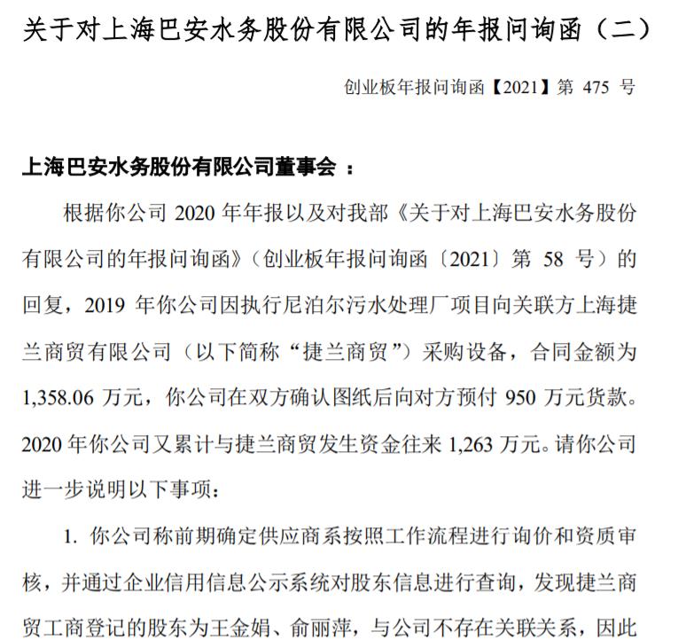 6月6日,深交所向上海巴安水务股份有限公司(下称巴安水务)发出年报问询函,要求其就采购合同涉关联交易、关联方主要财务指标、追加支付款项的原因及合理性、将相关往来款认定为非经营性往来款的原因及依据等问题进行说明。并于6月10日前将说明材料报送并对外披露。