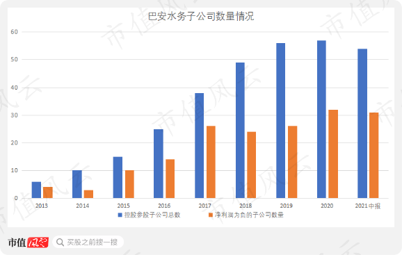 2012年,巴安水务只有4家子公司,到了2021年,参股子公司54家,半年报显示对净利润影响达10%以上的参股公司高达41家。