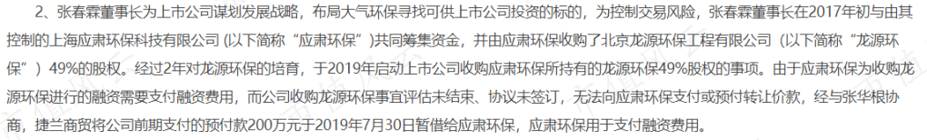 根据公司公告描述,董事长经过2年对龙源环保的培育,因而需要对董事长2017年收购龙源环保支付额外的融资费用。