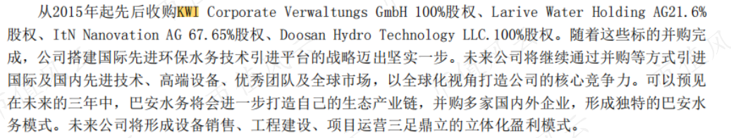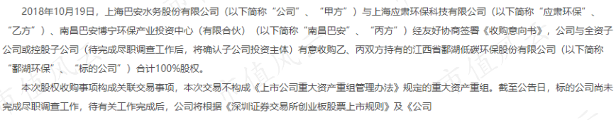 2018年10月,巴安水务公告称计划收购江西省鄱湖低碳环保股份有限公司(以下简称“鄱湖环保”)全部股权。