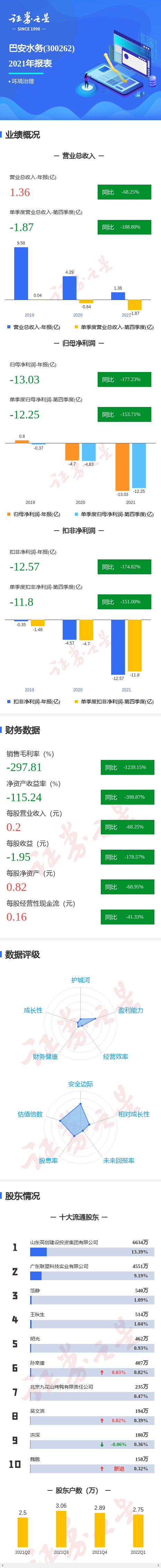 巴安水务2021年报显示,公司主营收入1.36亿元,同比下降68.25%;归母净利润-130369.15万元,同比下降177.23%;扣非净利润-125702.58万元,同比下降174.82%;其中2021年第四季度,公司单季度主营收入-18715.87万元,同比下降188.8%;单季度归母净利润-122559.97万元,同比下降153.71%;单季度扣非净利润-118066.93万元,同比下降151.0%;负债率87.02%,投资收益452.65万元,财务费用1.28亿元,毛利率-297.81%。