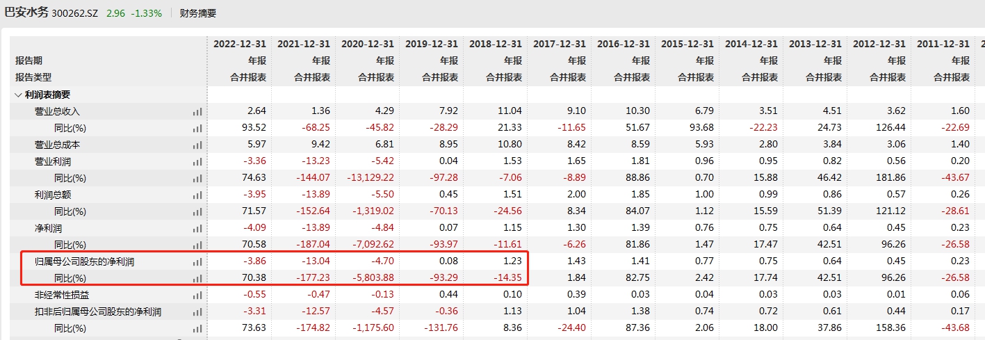 财务数据显示,巴安水务近年来业绩持续承压,净利润自2018年开始出现下滑,并于2020年出现上市后首次亏损。2020年至2022年,公司分别亏损4.70亿元、13.04亿元和3.86亿元。