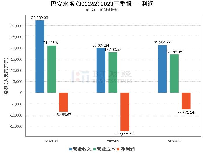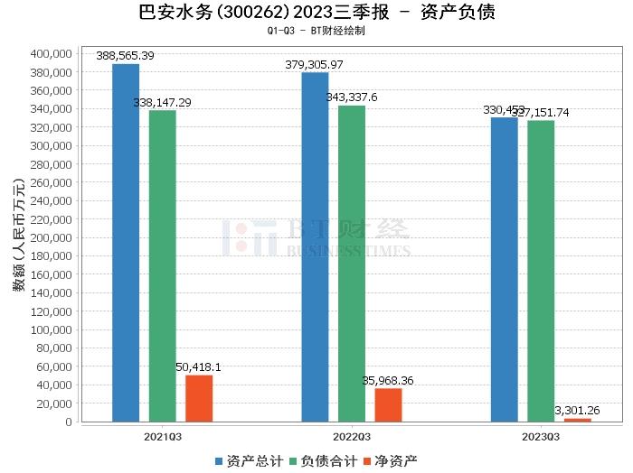 从资产负债方面看,巴安水务2023年三季度的总资产为33.05亿元,相比上年度末的35.78亿元有所下降。负债合计为32.72亿元,同样较上年度末的34.83亿元有所减少。公司的净资产为3301.26万元,相比上年度末的9418.9万元有所下降。资产负债率为99%,较上年度末的97.37%有所提高。