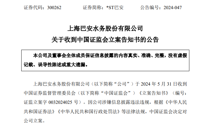 5月31日晚间,*ST巴安(300262)公告,因涉嫌信息披露违法违规,中国证监会决定对公司立案。