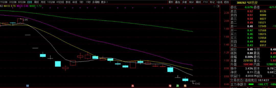 6月5日,*ST巴安股价大幅上涨20.83%,股价重新回到0.50元/股以上,略微缓解了投资者的心理压力。此前的三个交易日,*ST巴安连续大幅下跌,跌幅分别为16.47%、19.72%、15.79%,6月4日股价首次跌破0.50元,6月5日早盘最低更是跌至0.42元/股。