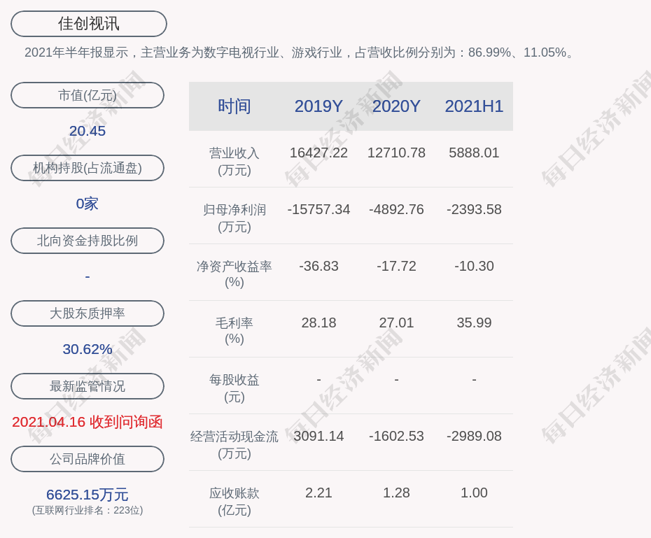 2021年半年报显示,佳创视讯的主营业务为数字电视行业、游戏行业,占营收比例分别为:86.99%、11.05%。