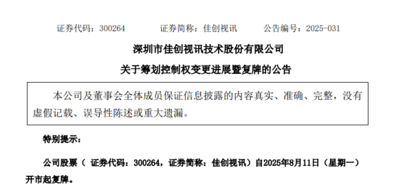 近日,佳创视讯(300264)披露了筹划控制权变更进展暨复牌的相关公告。