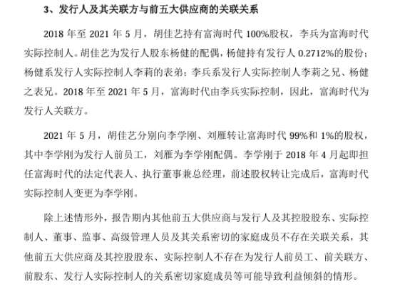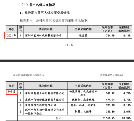 然而,在2021年11月23日披露的招股书中,2020年,主要采购内容为逆变器的富海时代跃居为公司第二大供应商,并于2021年上半年成为第一大供应商,采购金额分别为790.51万元、764.98万元。资料显示,该供应商成立于2016年6月28日,采购增加的原因主要为公司技术方案升级对小功率逆变器需求增加,且公司使用的小功率逆变器定制化较强,该富海时代产品符合公司需求,且配合度较高,因此对其采购增加。
