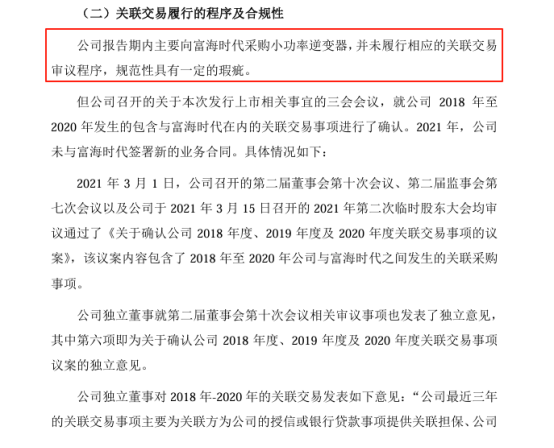 瑞能股份对此回应称,报告期内向富海时代采购小功率逆变器,并未履行相应的关联交易审议程序,规范性具有一定的瑕疵。