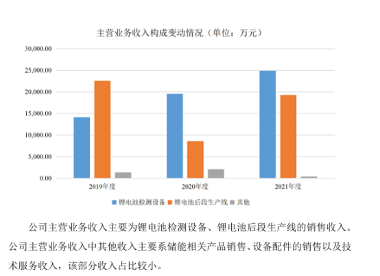 根据2022年5月11日披露的招股说明书,2019年至2021年,其营业收入分别为38139.65万元、30328.61万元和44728.83万元,公司净利润分别为9907.30万元、5165.27万元和6521.53万元。其中,2020年公司营业收入和净利润同比分别较2019年下滑20.84%和47.86%,主要原因为公司锂电池后段生产线收入下降。报告期内,该业务销售收入分别为22562.42万元、8601.96万元和19172.19万元,占主营业务收入的比重分别为59.31%、28.46%和42.92%,出现较大波动。