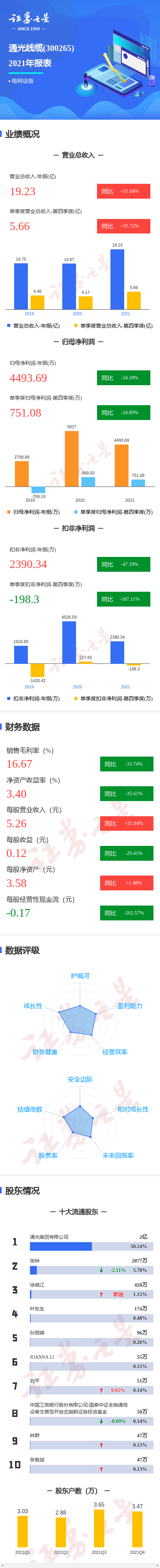 通光线缆2021年报显示,公司主营收入19.23亿元,同比上升31.04%;归母净利润4493.7万元,同比下降24.18%;扣非净利润2390.35万元,同比下降47.19%;其中2021年第四季度,公司单季度主营收入5.67亿元,同比上升35.72%;单季度归母净利润751.09万元,同比下降24.89%;单季度扣非净利润-198.3万元,同比下降187.11%;负债率47.4%,投资收益-1087.82万元,财务费用3663.48万元,毛利率16.67%。