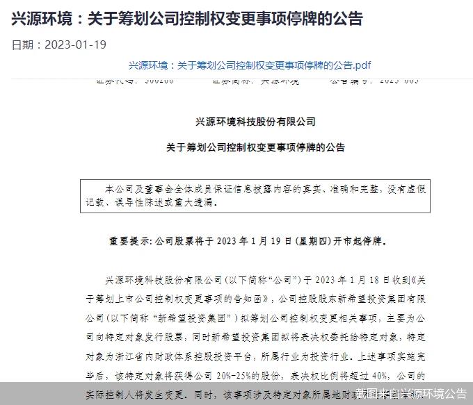 由于涉及控制权变更事项,兴源环境自1月19日起停牌。