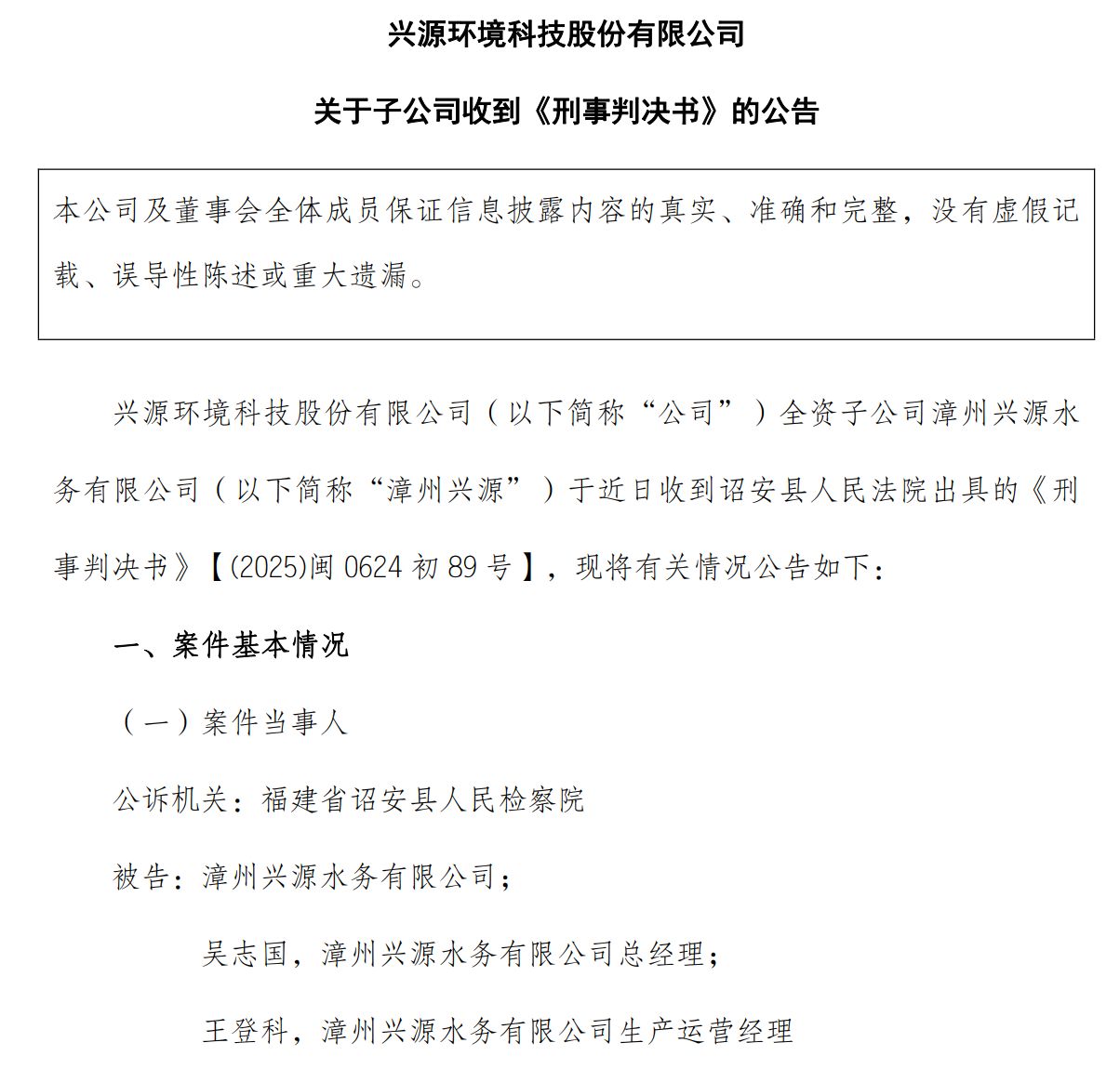 8月27日,兴源环境(300266.SZ,股价2.73元,市值42.42亿元)公告称,其全资子公司漳州兴源水务有限公司(以下简称“漳州兴源”)于近日收到诏安县人民法院出具的《刑事判决书》。