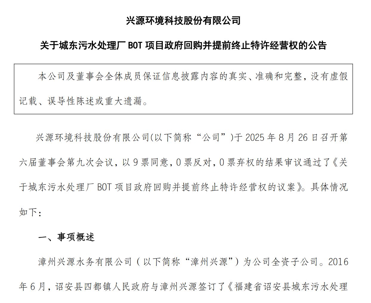 兴源环境称,鉴于此,近日公司、漳州兴源与诏安县四都镇人民政府、诏安工业园区管理委员会签订附生效条件的《关于提前终止福建省诏安县城东污水处理厂特许经营权之回购协议》,一致同意提前终止城东污水处理厂相关的特许经营权,并由诏安县四都镇人民政府按照约定价格回购该项目的相关权益。