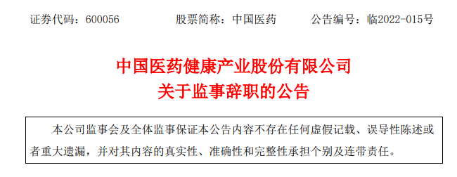 公告内容中指出:近日,中国医药健康产业股份有限公司监事会收到陈峥先生的书面辞职函,因工作调整原因,陈峥先生申请辞去公司监事职务,并不再担任公司任何职务。