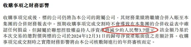 但是,联想控股就要受累了。上述交易完成后,归属于联想控股权益持有人的净资产将减少3.7亿元。