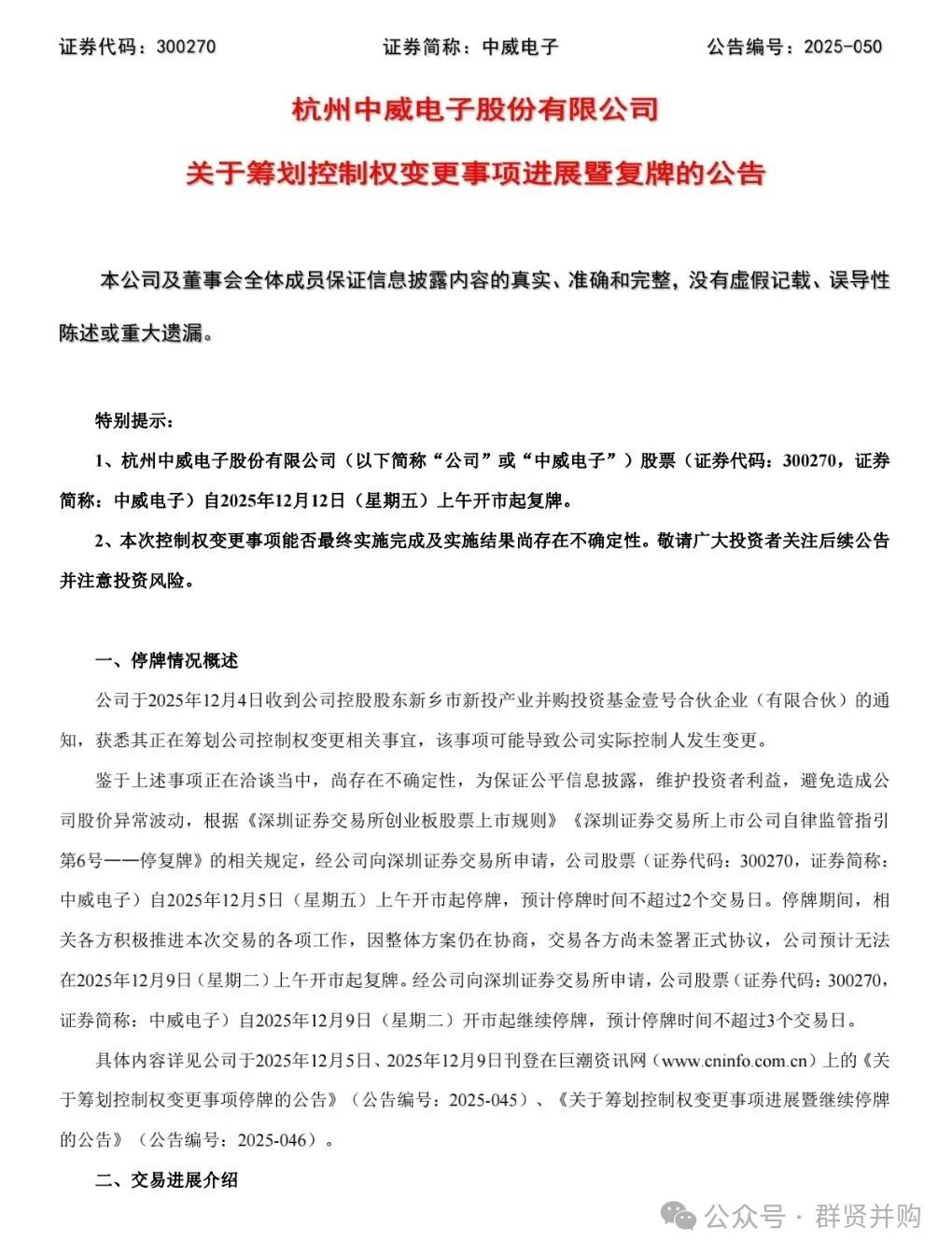 2025年12月11日, 中威电子 发布公告称,公司实际控制人即将变更。公司股票于2025年12月5日起停牌,并将于次日(12月12日)复牌。