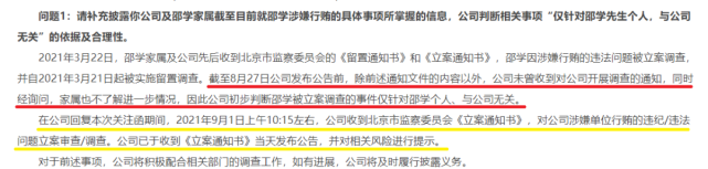 董事长被调查与公司真的无关吗?在9月2日公司回复深交所关注函时,称公司回复本次关注函期间,2021年9月1日上午10:15左右,公司收到北京市监察委员会《立案通知书》,对公司涉嫌单位行贿的违纪/违法问题立案审查/调查。公司已于收到《立案通知书》当天发布公告,并对相关风险进行提示。
